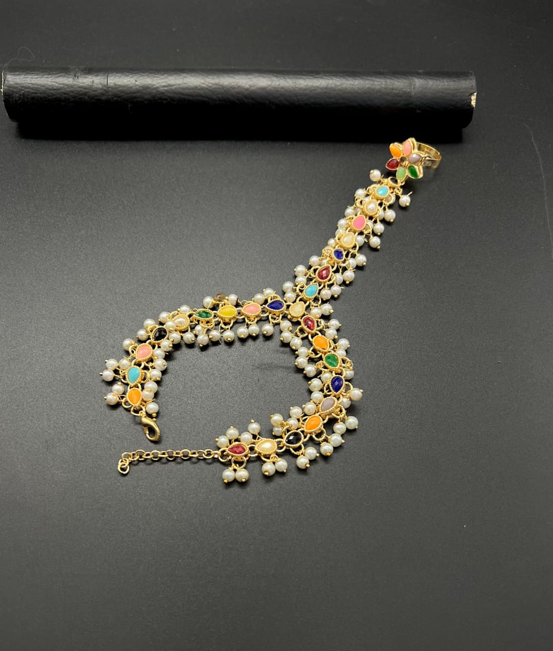 Elegant floral hand chain bracelet crafted with shimmering crystals and white stones. Perfect for bridal wear or special occasions, it adds a touch of sparkle and sophistication to any outfit. 💎✨
