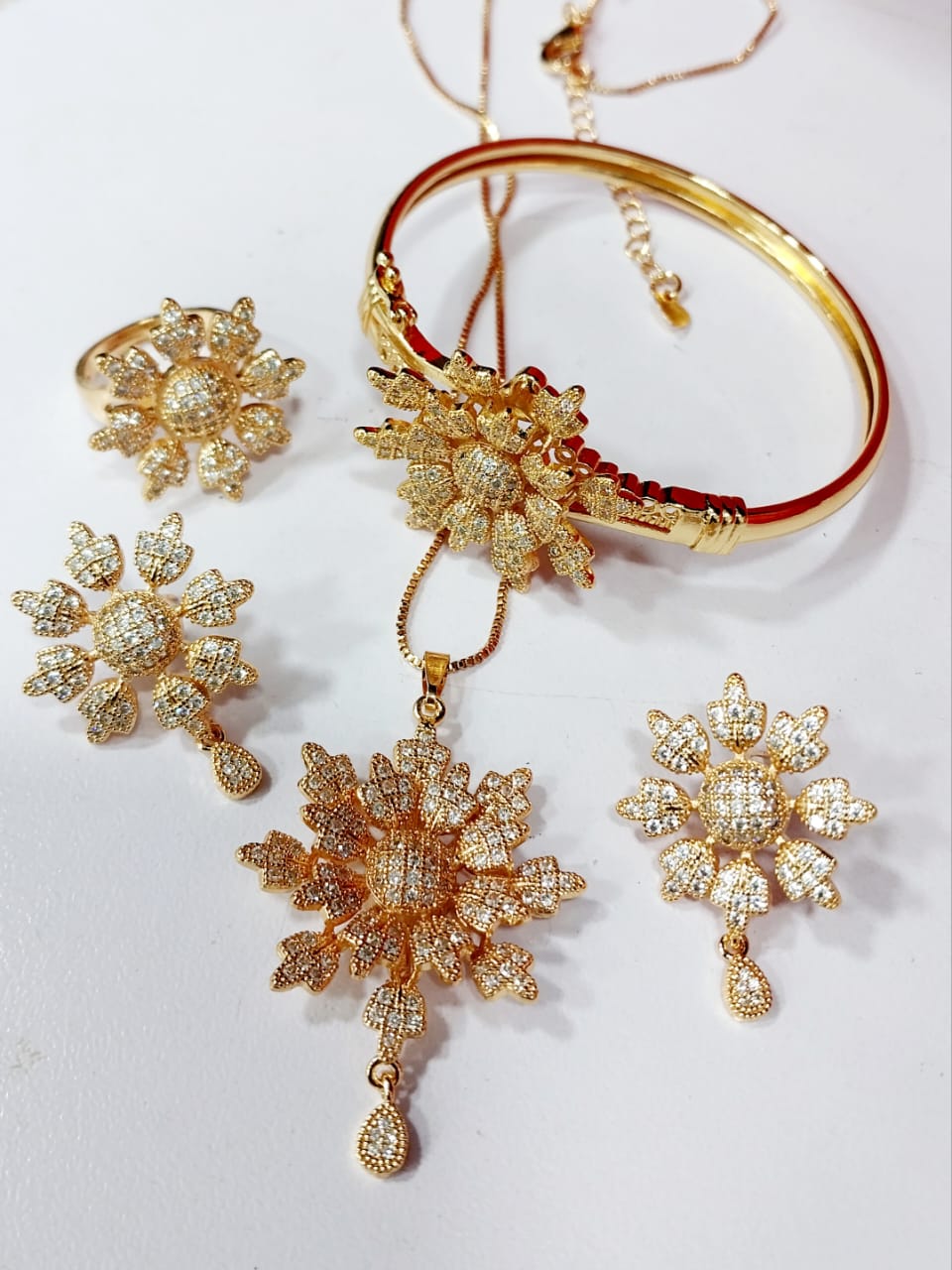 A stunning 5-piece Chan Lokit jewelry set that adds elegance to any outfit. Includes matching Chan Lokit, Topes (earrings), Ring, and Bracelet — perfect for weddings, parties, or daily wear. Designed with fine craftsmanship and a beautiful finish for a luxurious look at an affordable price.